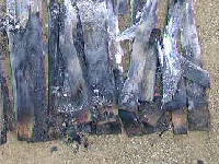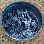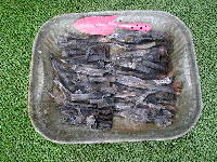 左の写真は、燃えすぎてしまった竹炭です。下半分は立派な炭ですが、上の方は灰になってしまったようです。小さなオイル缶を用いた窯ですから、上と下・穴との距離などいろんな条件が重なってしまいます。竹炭はのこぎりできれいに切れますので、端を切り落として使用すればいいです。