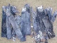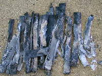 左の写真は、よくできたと思われる炭です。両端もきれいに焼け、折れてもいません。白っぽく見えるのは、竹の皮(表面)と思います。これは、ていねいにすれば、取ることができます。
