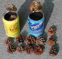 オイル缶で竹炭を作るときに、一つの実験をしました。それは松かさを炭にしてしまおうというものです。そのままでは燃え尽きるおそれがありますので、ジュースの空き缶に入れておきます。アルミ缶のふたを缶きりで開け、小さめの松かさを数個入れます。そしてふたをしますが、オイル缶に入れるときは逆さまにして入れます。