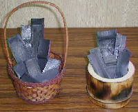 オイル缶で作った竹炭を保存して、どのように利用しようかと考えていました。一番簡単な物は、そのまま消臭剤としての活用です。写真のようにかごや竹にいれてみました。このまま部屋に置きましたが、全体が黒いので味気ない感じもします。長さはのこぎりで切り、同じにならないようにしています。