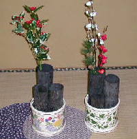 インターネットで調べると、竹炭販売業者のホームページがたくさんあります。その写真を参考にして作ったのが、上の写真です。この炭は、オイル缶で焼いた物ではありません。保護者の方に、ドラム缶で焼いた物をいただきました。しかも、孟宗竹のままの状態で炭になっています。これを植木鉢の受皿に立て、花瓶に見立てて造花をさしました。右は松と紅白の梅、左はヒイラギです。