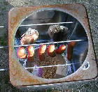 七輪に炭を入れ、いよいよ着火です。火がついたのを確認して、一斗缶を乗せます。ソーセージや乾物が行儀よく並んでいます。この後ふたをして、横の穴に温度計をさしました。あとは時間がたつのを待てばいいわけですから、暇になります。そこで、バイクに乗って出かけてしまいました。