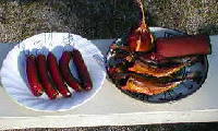 さて、自宅の庭で燻製つくりに挑戦です。平成14年3月9日のことです。素材は、アジの開き・かまぼこ・チーズ・ウィンナーソーセージの4種類です。この中でチーズとかまぼこはひもで結び、アジの開きとウィンナーソーセージはクリップで下げるようにしました。