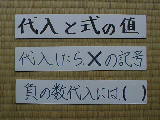 | 文字のきまり3 | 代入カード | 「代入したら×の記号」「負の数代入には( )」 |
