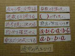 この10枚のカードは、計算のきまりを示す カードです。負の数導入と累乗の導入で、 小学校の計算法則が異なってきます。つまり 優先順位が変化します。指導の途中でも確 認します。 |