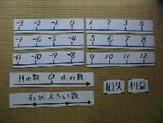 最初は1m位の板を使って、数直線定規を作りました。しかしマグネットを利用できないので、厚紙に書いて作りました。長さは30cmです。黒板に貼り、つなぐことができます。負の数は、最初の数の拡張です。0を基準とした負の数は、イメージが大切です。右方向に数は大きくなることを指導しておけば、関数の学習にもつなぐことができます。 | |