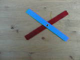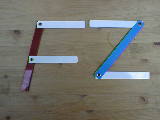 縦横15cmくらいの教具です。プラスチックをはさみで切って作成しました。実は、対頂角と同位角そして錯角はアルファベットで捉えさせました。XとFとZ(N)です。 これらを板書の図形の上において、説明しました。裏にマグネットを付けています。角はハトメでつないでいますから自由に曲がります。 |