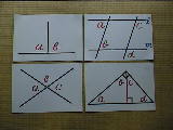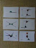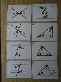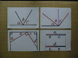 これは証明に入るときに練習したカードです。なぜ等しいのか、その理由を考えさせました。図によっては、レベルの高いものがあります。証明の根拠を追求するものです。この8枚は、厚紙(B4)出作成しました。 | ![]() |