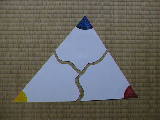 三角形の内角の和は180度になる、その証明です。補助線もゴムひもで示すことができます。このとき、上の青カードは回転させつつ下ろし、左の黄カードは平行移動して示す必要があります。いかに印象付けるかがポイントです。 |