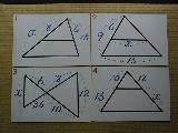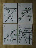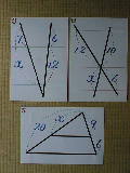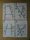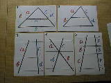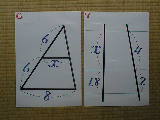 | 上のカードに続きます。少しずつ難しくなります。三角形の辺と平行線の線分が区別できて、しかも共通点に気づいてくれればいいのですが。 | ||||