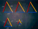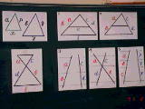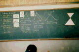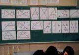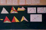 | このページの五枚の写真は、授業中の写真をスキャナで取り込んだものです。右の写真は重心によって面積が何分の一になるかを指導しているところですが、切り刻んだカードはやや扱いにくい面もあります。 | ||||