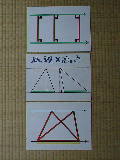 | 左のカードは、等高等底の根拠を示した三枚です。距離とか高さは、みずから補助線を引く(念頭操作)必要があるのでわかりにくい面があります。右の写真は有名な問題ですが、これもゴムひもで説明しました。色チョークで何度も塗るとかえって分かりにくくなるので、私はこの方法で指導しています。 | |||