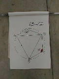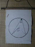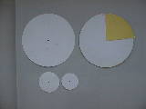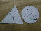 | 左の大きな円は、厚紙で作っています。黄色の部分は色画用紙です。厚紙は二枚重ねですから、その中で色画用紙がスライドするようになっています。円の学習では、導入場面で使用しました。右の写真は円の内接三角形と外接三角形の指導に用いたものです。 | ||||