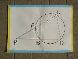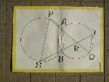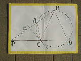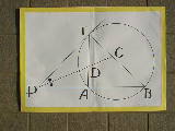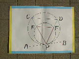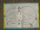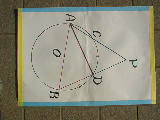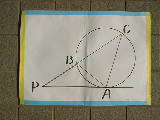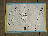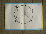 | 横75cmの広用紙に、円・二円の問題を描きました。証明するためにカラーマグネットを 利用しました。授業が楽しくなるように、いくつか名前をつけてみましたが、生徒は首をひ ねっていたようです。私も混乱していました。 |