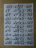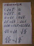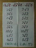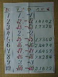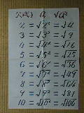 整数を根号の中に入れる練習の広用紙と、根号の中にある平方数を外に出す練習の広用紙です。一斉に暗唱させたり、あるいは指名して答えを言ってもらいました。なくてもいいですけど? もちろんプリントの問題も使用しました。 |