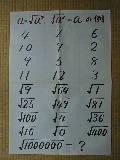 平方根の近似値を調べる方法は、二つあります。左は、電卓利用の学習に用いました。電卓の絵を掲示してみました。一度も使ったことのない生徒もいます。百聞は一見にしかず。√の記合を考えた人も偉いと思いますが、生徒には抽象的な数でしかありません。正方形の一辺といっても、ピンとは来ないのです。 |