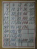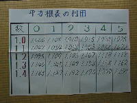 教科書巻末の平方根の見方を指導するとき、意外と時間がかかります。それで最初の指導のときに、この表を見せました。縦と横のラインを一致させるのが生徒にとってはわかりにくいようです。それでも表が読めない生徒がいる時は、側まで行って指導します。 |