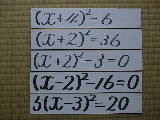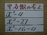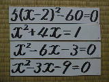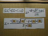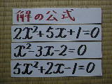 解の公式を指導したときのものです。 横1mあります。公式を書いて、中を くりぬきました。そこにチョークで書き ます。授業開始のとき、何度も暗唱 させて練習しました。 |