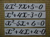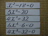 | 二次方程式の難しさは、式を見てその解法を自ら判断しなければならないことに あると思います。最初はその式のパターンをじっくりわかるように指導しないと混 同するおそれがあります。また指導者も因数分解や解の公式を早く教えたいため に、急いでしまうことさえあります。教科書の例題だけでは不足しますので、カード を用いて例題としました。解法ごとに長封筒にいれています。 |