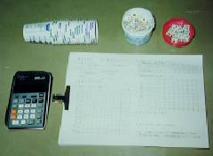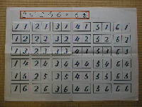 左の写真はさいころ2個の組み合わせ表です。計算による確率の学習で使用しました。慣れれば必要ありません。 右は確率の実験(同様に確からしい)をしたときの道具です。電卓は班に一つずつ持たせています。 |