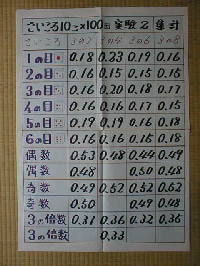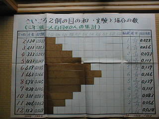 | 左・・班にそれぞれ実験させた記録です。さいころ10を同時に100回延べ1000回振らせました。この実験は4クラスしましたので、すべてを書いています。ばらつきはありますが、当初の目的は達したと思っています。一つの班は、4人構成にしています。実験係・記録係・電卓係・表作成係です。 右・・さいころ2個の目の和を確認する実験の記録です。これも4人の班で協力しました。一人100回振った記録を集計しました。きれいな形に納まりました。色を塗る代わりに、ガムテープを貼っています。幅が5cmですから広用紙に貼るのに都合がよかったのです。 |
