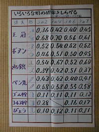 左は、木ネジと押しピンです。これも実験に用いました。 右は班を編成するときの表です。4人一組です。みんなで協力してくれたのがうれしかったです。 |