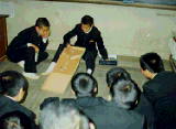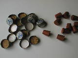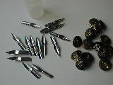 | 「同様に確からしくない」実験です。計算では求められないので、必然的に実験をさせます。班ごとに道具を選ばせました。上の写真では、王冠・ゴム栓・アルミ鋲小・アルミ鋲大・ペン先・学生ボタンです。紙コップでは小さいので、カップラーメンのケースで振らせました。生徒の予想とは異なる結果になります。ペン先の実験では、時々「先生、一本見つかりません。」と騒いでいましたが、これはケースの内側にささっていたからです。また、アルミ鋲も1000回に1〜2回逆のT型に立つことが分かりました。 | ||||