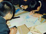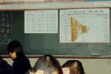 | 授業の風景です。黒板に貼った広用紙と同じように、画用紙に実験結果を紙テープで作っています。右の写真は、ビー玉を上から落として正規分布の形になるのを実験しているところです。 | ||||