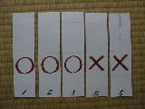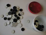 | 硬貨の実験ではお金を使いますが、私はオセロゲームのチップを使用しました。なぜなら、硬貨の表裏は記録のミスが出るからです。これなら白を表と決めておけば便利です。一人に二枚配布して全員に実験させました。表・裏の確率は2分の1であることの確認がとれます。 | ||||