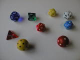 | 左は玩具店で購入したさいころです。正多面体の物から、球のさいころまであります。子どもも不思議そうな顔をします。あたりはずれのくじの実験では、くじのカードに番号を付けておくと考えやすくなります。 右の表は「誕生日一致の実験」です。一つの部屋に23人いれば誕生日が一致する確率は70%近くになるそうです。以前、30学級の名簿で確認しましたが、ほとんどのクラスで一致する生徒がいます。これは教室で実験するとおもしろいです。黒板に月だけを書いておき、その下に生徒全員に誕生日を記入させていきます。多いときには、3組いたりします。 |