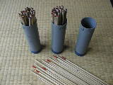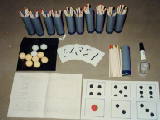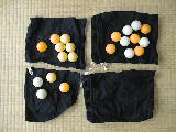 | くじの実験も楽しいです。プラスチック管を鋸で切断し、底に紙を貼ります。また、箸の先に色をつけてくじにします。10個くらいを準備しました。右の写真は、黒の布袋とピンポン玉のセットです。現在はカラーのピンポン玉が入手できますので、大変便利です。白・黄・朱があります。布袋は、生徒が作ってくれました。 | ||||