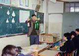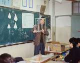 | 上の三枚は授業風景です。アルミ製の直方体や空き瓶あるいはボール等を持ち込んで研究授業をしました。数学の世界に一度生活のかおりを持ち込むのもいいですね。小学校はよくします。子ども達にまず、体積比はどのくらいになるかを考えさせているところです。なかなか正解はありません。 | ||||