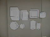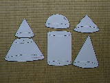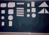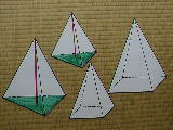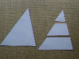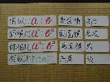 | ここはカードが中心になります。相似の立体模型(のつもり)です。公式を書いたカードも準備しました。黒板に張りつけた状態が右の写真です。二乗比・三乗比が中心の学習です。 | ||||