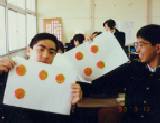 | 右の写真は、みかんの皮を使って球の表面積を学習したものです。円面積の4倍を確認させました。画用紙にみかんと同じ直径の同心円を六つほど描かせ、糊で貼りました。楽しい授業も魅力の一つです。 | ||||