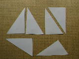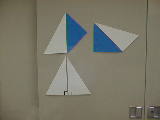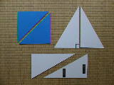 | 右二枚の写真は、プラスチックで作りました。正方形と正三角形から作っています。もちろん三角定規セットと同じ比にしています。これも利用価値は高いです。裏にマグネットを貼っています。 左は厚紙です。黒板に貼り、三辺に3.4.x のように書き加え計算練習させました。三角形の向きを変えて貼ることが大切です。意識的に斜辺を下に置くからです。時間短縮ができる教具です。 |