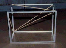 アルミのL型の棒で作成しています。金のこで切り、かどは三方向を結ぶことのできる金具を利用しています。特別な接着剤(エポキシ系)を使いました。サイズは60.40.25cmになっています。工夫したことは、対角線が見えるようにヒノキ棒も準備したことです。この棒ははずせます。切断の念頭操作は、考えにくいものです。抽象的なものは視覚に訴えるのが近道と思います。 | |||