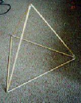三角錐の体積を求める学習のために考えました。40cmほどのヒノキ棒の両端に、クリップをJ型に切り糸で結びました。こうすることで組み立てと分解が自由になります。 「これは素晴らしいアイデアだ。」と思いましたが、四角錐のときグラグラ動くことに気づきました。四角錐の場合は対角線にひもを張ればいいです。 |