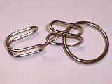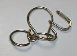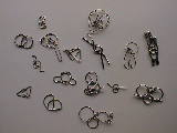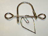 | 左 | U字の形をした金具をはずすパズルです。丸い輪がじゃまをして、はずれにくくしています。解ければ単純なパズルと思います。このタイプは、友人にさせて困っている顔を見ているのが楽しい。ギブアップしたら得意げにはずしてみせます。 |
