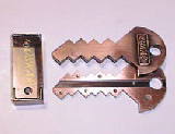 | 左 | かぎをはずすパズルです。二枚のかぎは溝でスライドしますが、このときに切り欠きが一致したとき、すこし移動できるように工夫されています。試行錯誤で解決できます。力の強い人ほど早く解けます。? |