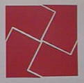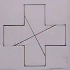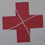 | 十字形の形から四つに切って作られたカードを並べ替えて、正方形にしなさいというものです。単純な遊びですが、少しまごつきます。このタイプの切断のヒントは、「新しく作られた直角が四隅にくる」ということです。しかも同じ形で追いかけるように配置しますので、追いまわしといいます。三平方の定理証明にも現れます。 | |
