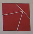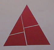 | 正三角形の形から四つに切って作られたカードを並べ替えて、正方形にしなさいというものです。単純な遊びですが、「正方形を作れ・1」よりも難しくなります。このタイプの切断のヒントは、「新しく作られた直角が四隅にくる」ということです。そして、このパズルは最初の60度が合わさり、内部で180度をつくっています。 | |
