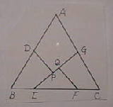 この切断はすこし難しくなります。一応説明しますので、実際に作りながら調整してください。DとGは、辺の中点です。EFの長さは辺BCの半分です。線分DPとFQは、GEに対して垂直に交わっています。正三角形の一辺をaとしたとき、正方形の一辺は0.658aになります。 |