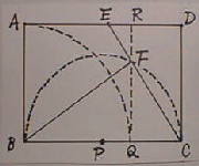 縦と横の比が0.682:1の長方形をつくります。黄金比ではありません。ABと等しい点Qをとります。点Qから垂線QRを引きます。次に辺BCの中点Pをとります。Pを中心に半円を描きます。先ほどのQRとの交点をFとします。そしてBFとCFEの線を引きます。なお線分ECとBFは90度をつくっています。 |