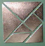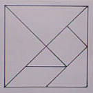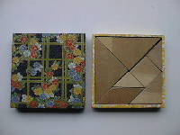 | いくつかに分割・切断された片を全部使って、指定された形を作るパズルを総称して、タングラムといいます。ここで紹介しているのは、中国のもので「七巧図」と呼ばれる物です。1800年のはじめ頃、ヨーロッパに伝えられ流行しました。現在は正方形だけでなく、長方形・円形・卵形から分割されたものも開発されて、市販されています。(出典 高木茂男著「Play Puzzle」 平凡社) | ||