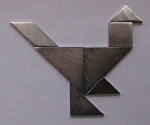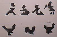 | 正方形から切り出された7片をすべて使って、指定された形をつくる遊びです。動物・人・植物・道具・幾何学模様などその形はさまざまです。写真右は、人と鳥です。タングラムは一人遊びの要素が強く、いつでもどこでも楽しめる良さがあります。しかも作りやすいという手軽さもあります。幾何学模様の中には、平面図形が多いため、算数と数学でも取り扱うことがあります。教育の世界とパズルの世界は密接な関係があります。 |