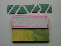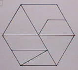 ケースに入れた状態は長方形ですが、作図は正六角形から始めます。中心を通る二本の対角線、点を結ぶ対角線の一部、辺の中点を結ぶ線分で構成されます。他のタングラムが45度や90度の線で切断するのに対して、これは30度60度120度をもっています。上の写真の素材は、版画用のゴム板(10×15cm)です。 |