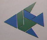 | 上の写真は、色のついたゴム板で自作したものです。一つおきにI・V・Yと読むことができます。それでこのパズルはアイビーパズルと名づけられました。遊び方は他のタングラム同様、7片で指定された形をつくるものです。 |