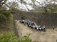 平成11年10月6日に熊本城に行きました。修学旅行生が天守閣に向かっていましたが、この急な曲がり道を見て何を思ったでしょうか。本丸御殿は明治10年の西南戦争で、突然の火災で天守閣とともに焼失しました。当時は貴重な文化財という発想はなかったのでしょうか。