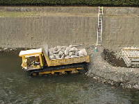 平成11年の秋に、坪井川で工事が行われました。放流されている鯉のために棲み家を作っているのです。これで大雨のときも、鯉は流されません。工事用のダンプカーには、キャタピラがあります。珍しいので思わず撮影しました。完成後、コイが言いました。「みんなこっちに、コーーーーーイ」