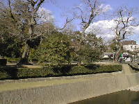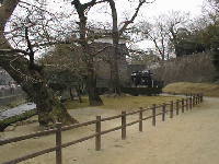 厩橋(うまやばし)のそばに、木が三本植えられています。現在熊本城の復元計画が進められていますが、そのためのポスターが市役所の各階に展示してあります。ポスターには、古い江戸時代の「絵地図」が使われています。その絵地図に、この三本の木が描かれています。多分そうだろうと思うのですが。